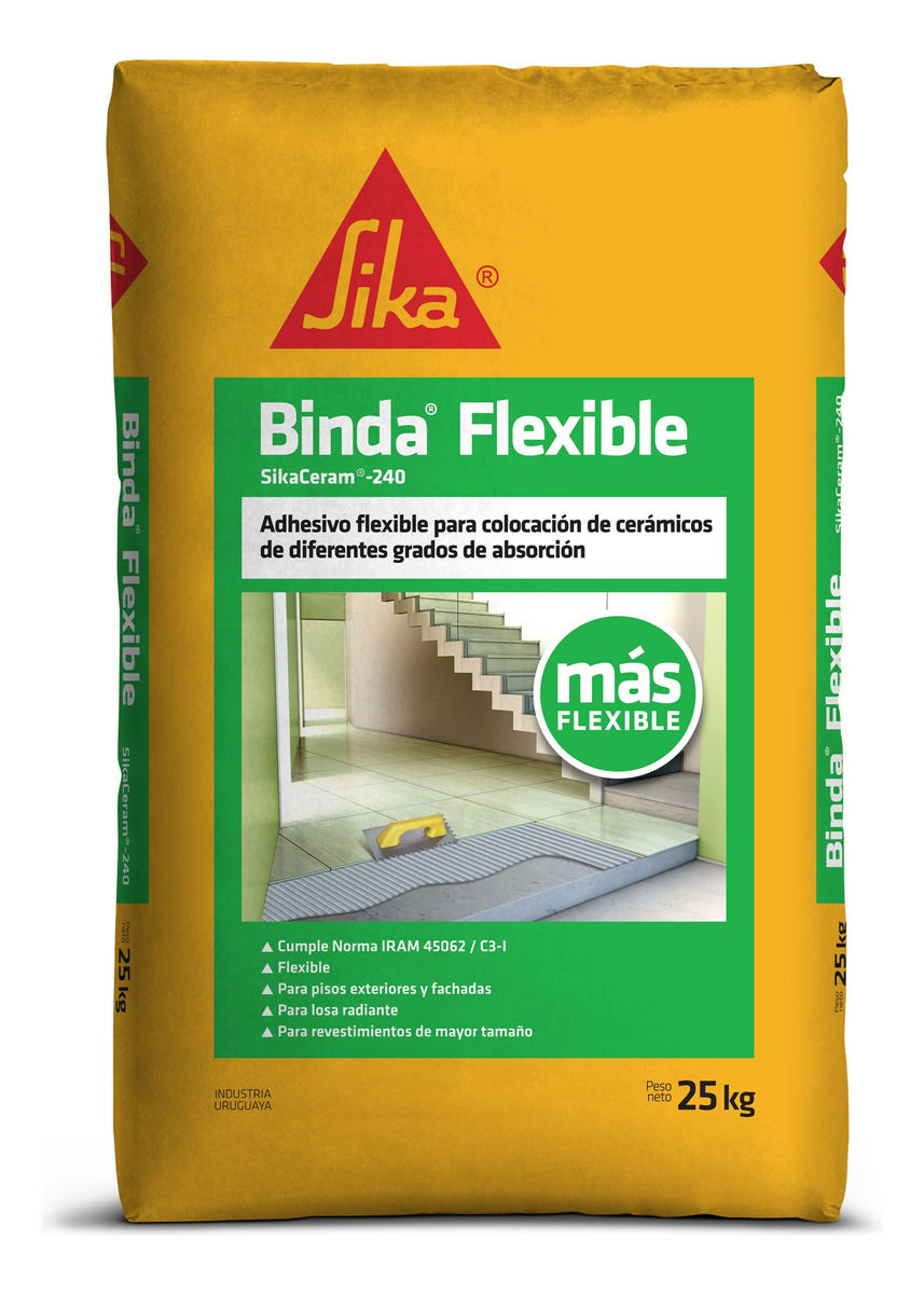Binda® FlexibleAdhesivo cementicio flexible para cerámicosBeneficios• Flexible.• Para aplicación en exterior.• Máxima adherencia.• Fácil mezclado y aplicación.• Excelente trabajabilidad.• Gran permanencia de la mezcla fresca.• Tiempo de abierto y de corrección muy prolongado.Cómo aplicarlo:El soporte debe ser plano, firme y estar limpio.La consistencia del producto puede ajustarse según el lugar de aplicación y sus requerimientos.Para uso vertical, la proporción es de 3 partes de Binda® Flexible con una parte de agua.En superficies horizontales, es posible obtener una consistencia más fluida, 2,5 de Binda® Flexible con 1 parte de agua.Colocar la mitad del agua necesaria en un recipiente adecuado para mezclar y agregar el polvo lentamente mientras se va revolviendo. Agregar el agua restante y continuar revolviendo hasta obtener una pasta homogénea y plástica.Se puede mezclar a mano o con mezclador mecánico de bajas revoluciones. Dejar reposar durante 10 minutos y volver a mezclar. Extender el adhesivo con llana dentada sobre el soporte, aproximadamente la cantidad que se pueda cubrir en 50 minutos.Colocar los cerámicos sobre los cordones de adhesivo y presionarlos hasta constatar que el mismo rebose.Se utilizarán aproximadamente 5 litros de agua limpia por bolsa de 25 kg.Consumo: 3 a 8 kg/m2Presentación: 25 kg